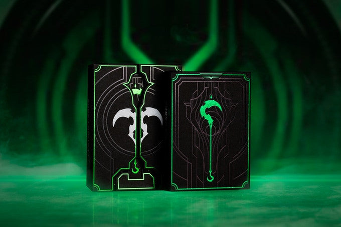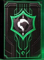 Das High Victorian Deck hat eine matt schwarze Kartenschachtel mit goldenen Verzierungen, metallic grünen Ornamenten und aufwändig geprägter Oberfläche. Die Joker und Bildkarten sind in schwarz...